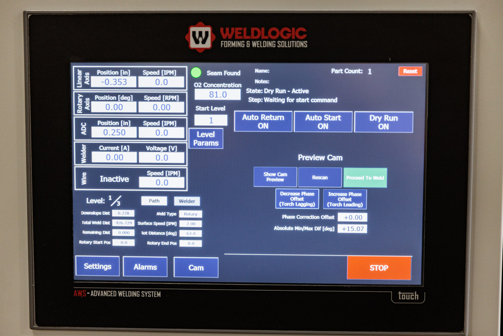Quick Purge to evacuate the tank to less than 100 P.P.M in 2 minutes, 2-D laser Seam Tracker to track over weld seam, and custom software to fit the customers requirements.